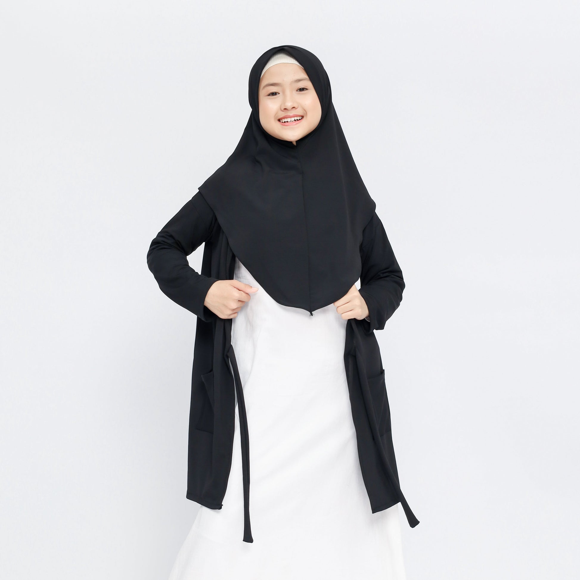 Hijab + cardigan jadi satu! Desain simpel, unik, dan praktis, tinggal pakai dalam hitungan detik. Cocok untuk anak aktif yang tetap ingin tampil rapi dan syar'i setiap hari.